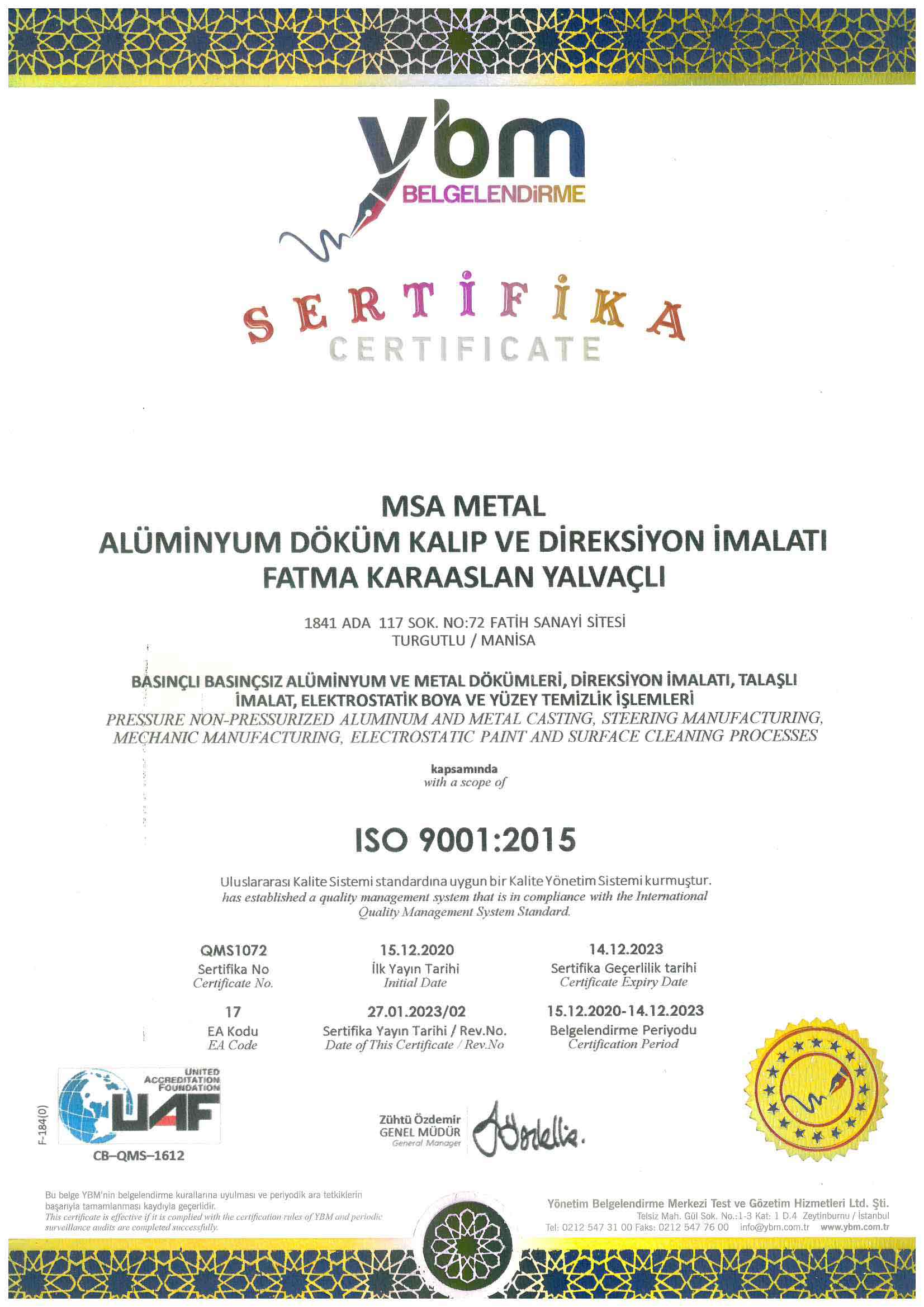 MSA Metal Manisa-Turgutlu Küçük sanayi sitesinde 600 m² alanda Alüminyum Döküm yöntemiyle iç ve dış piyasaya üretim yapmaktadır. Basınçlı / Basınçsız Alüminyum ve metal dökümleri, Direksiyon simidi imalatı, Talaşlı imalat, toz boya ve yüzey temizlik işlemleri üzerinedir. 0,50 gr'dan 4000 gr'a kadar ayda 50 ton metal işleme kapasitesine sahibiz.